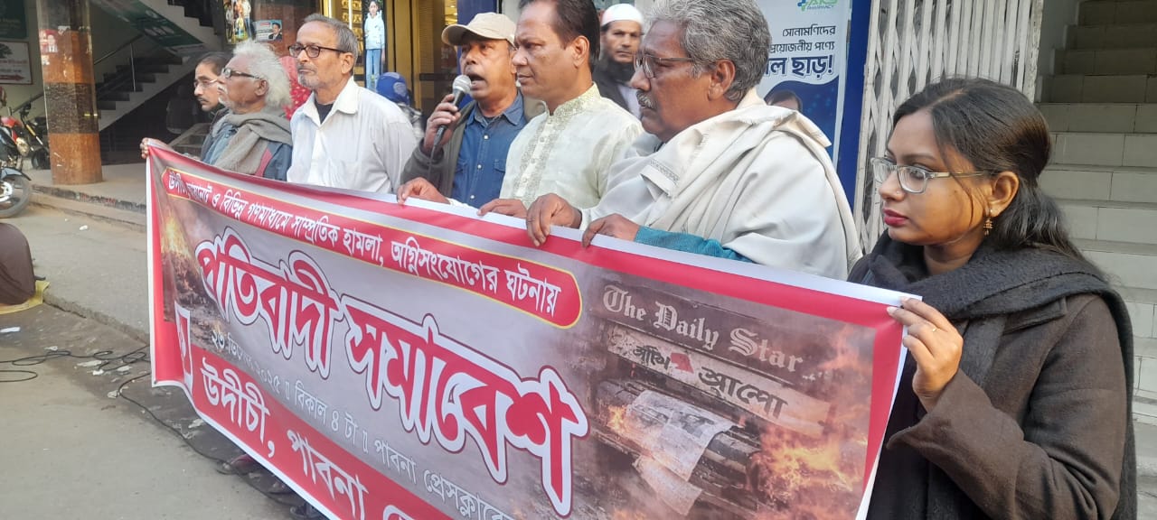 উদীচী ছায়ানট প্রথম আলো ডেইলি স্টারে অগ্নি সংযোগ মব সন্ত্রাস এর বিরুদ্ধে পাবনায় প্রতিবাদ সভা অনুষ্ঠিত