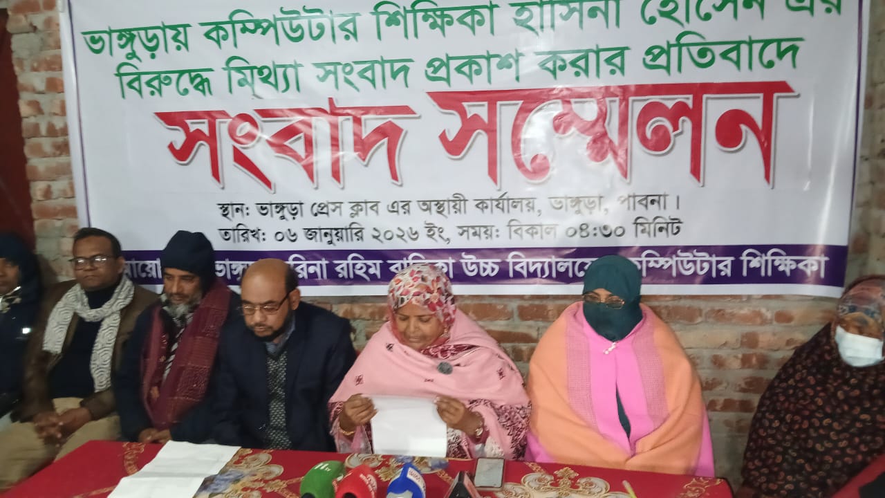 পাবনার ভাঙ্গুড়া উপজেলার জরিনা রহিম বালিকা উচ্চ বিদ্যালয়ের কম্পিউটার শিক্ষিকা হাসিনা হোসেনের নামে মিথ্যা সংবাদ প্রকাশ করার প্রতিবাদে সংবাদ সন্মেলন করেন। ৬ই জানয়ারি মঙ্গলবার বিকাল ৪.৩০ মিনিটে মিডিয়া কর্ণার হল রুমে এ সংবাদ সন্মেলন এর আয়োজন করেন। সংবাদ সন্মেলন হাসিনা খাতুন লিখিত বক্তব্যে অভিযোগ করে বলেন গত ৩১ ডিসেম্বর ২০২৫ তারিখে কম্পিউটার ব্যবহার করতে জানেন না বিদ্যালয়ের কম্পিউটার শিক্ষক। শিরোনামে একটি সংবাদ প্রকাশ করা হয়